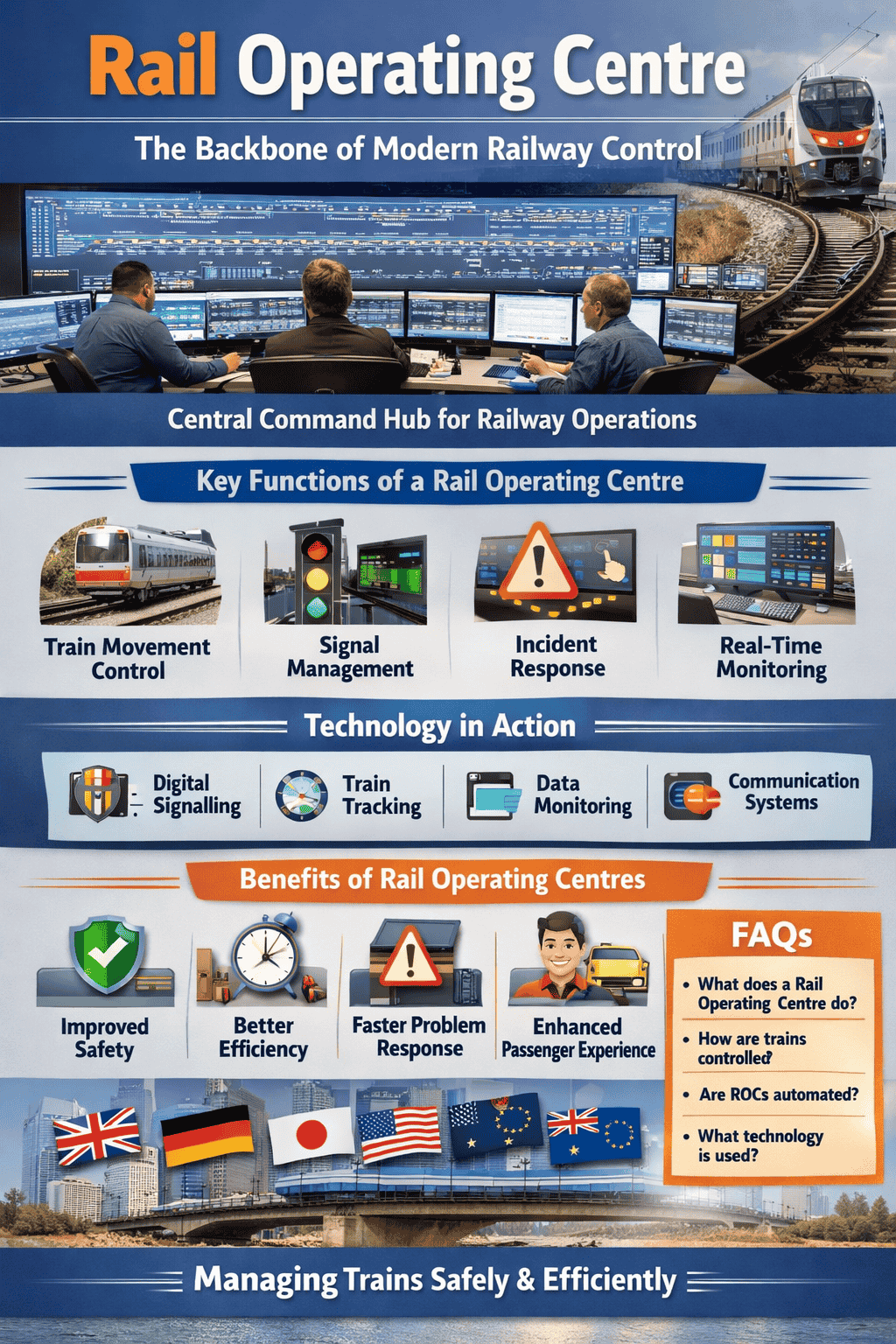 A rail working centre (ROC) is a centralized control facility in which railway operations are monitored and controlled in real time. it’s far the primary area where groups oversee educate actions, tune situations, signalling structures, and emergency responses.